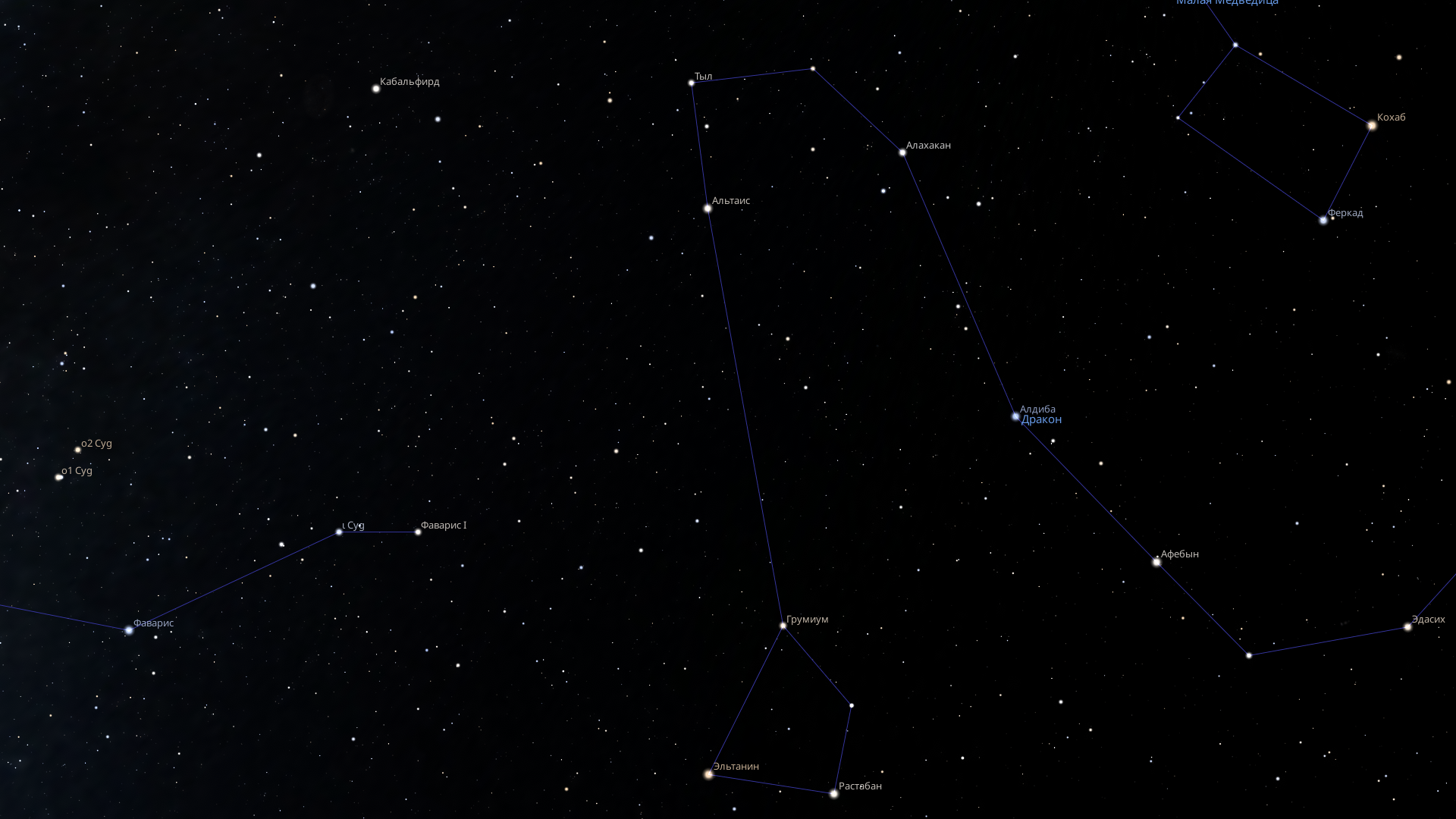 Самые яркие звезды созвездия Дракон это Этамин (гамма Дракона), Альдибаин (эта Дракона) и Растабан (бета Дракона). На территории созвездия находится множество известных объектов глубокого космоса, среди которых туманность Кошачий Глаз и галактики Веретено и Головастик.